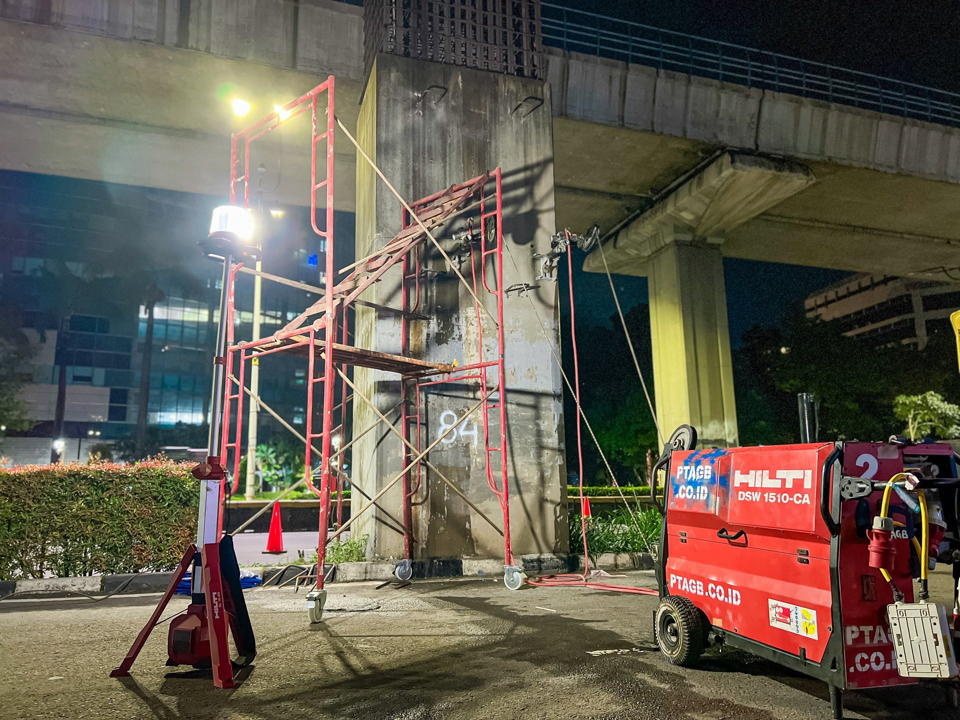 Peralatan utama yang digunakan adalah Hilti Wire Saw WS 1510-CA, yang dirancang khusus untuk pekerjaan pemotongan beton bertulang berukuran besar dengan performa stabil dan efisiensi tinggi. Penggunaan metode ini menjadi solusi terbaik dibanding metode konvensional karena mampu mengurangi risiko kerusakan struktur di sekitarnya.